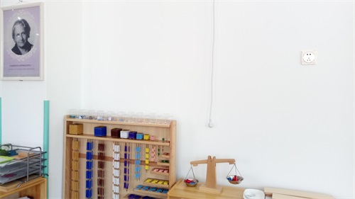 墙上挂着蒙氏教育创始人——玛利亚·蒙特梭利的画像。