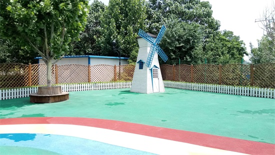 园长把我迎进园内,戴上参观证件后,她先带着我简单参观了一下室外活动场地,这种彩色地面全部采用环保塑胶材料,柔软防滑,四周都用两层铁栅栏和木栅栏围了起来。