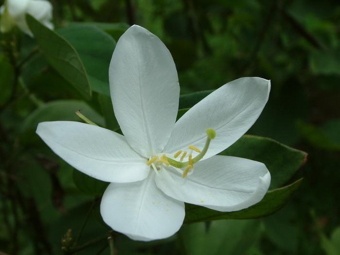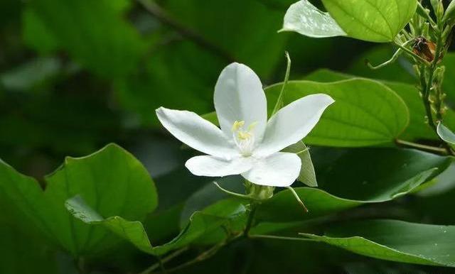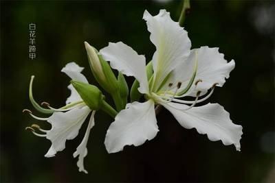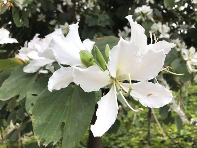 白花羊蹄甲的花数朵聚生,芳香,五片分离花瓣,白色