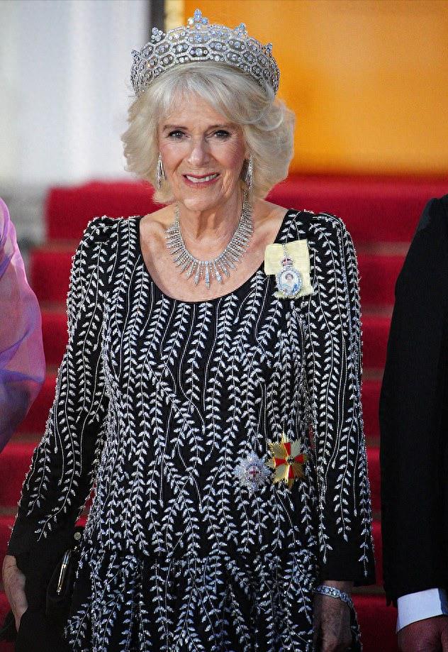 所以在访问德国的时候,卡米拉也是拿出了非常重量级皇冠,还有属于原本属于女王的胸针,这些代表着王室的珠宝,卡米拉可以尽情展现了。