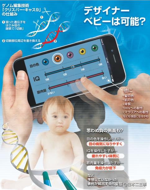 其实编辑基因在技术上已经不算是难事,只是在人为的伦理之上充满着众多的讨论。早在今年年中,日本媒体就有发布一篇文章,名为《(科学の扉)「想定外」を考える 望み通りの子、ひそむリスク》(《(科学之门)考虑“意料之外” 定制婴儿潜在的风险》。就如同科幻小说一样,写出了定制婴儿的项目,包括IQ、眼睛颜色、运动能力等方面。采用CRISPR/Cas9技术,将基因进行替换,理论上已经成熟。可是其中包含了很多未知的因素,因为人类原本就是出生于母体,如果认为加以改造,后果未知。比如修改了眼睛颜色以后,那么会不会带来其他的眼睛疾病;修改了IQ以后,会不会带来哪方面的先天缺陷;增加了肌肉量以后,对于免疫力是否会有影响?都无法确切的回答。对此日本的许多网友也是十分犹豫,始终觉得如何划分伦理问题将会成为焦点。