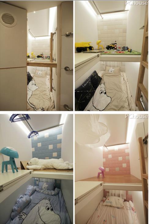 对于天花板高度低、空间狭小的住宅,他提出了以胶囊旅馆为原型的儿童房概念。不仅仅用于就寝,而是兼有学习、玩耍、收纳等可变性的胶囊。