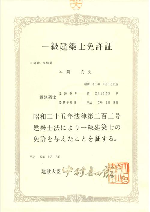 26岁的时候,本间贵史在日本取得了一级建筑士的证书。