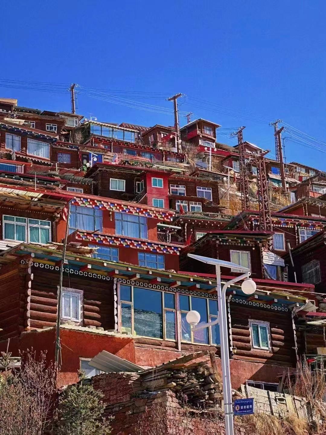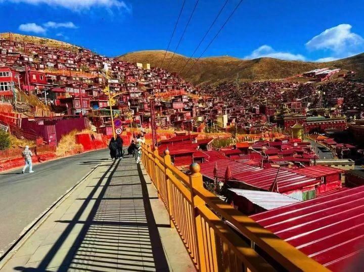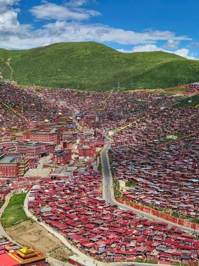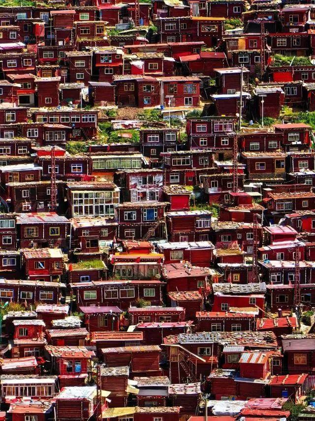 位于四川省甘孜藏族自治州色达县落若镇,️坐落在海拔3600米的山上,四周群山环绕,密密麻麻的绛红色小木屋延绵起伏,蔚为壮观,这里是五千名僧俗的住所。