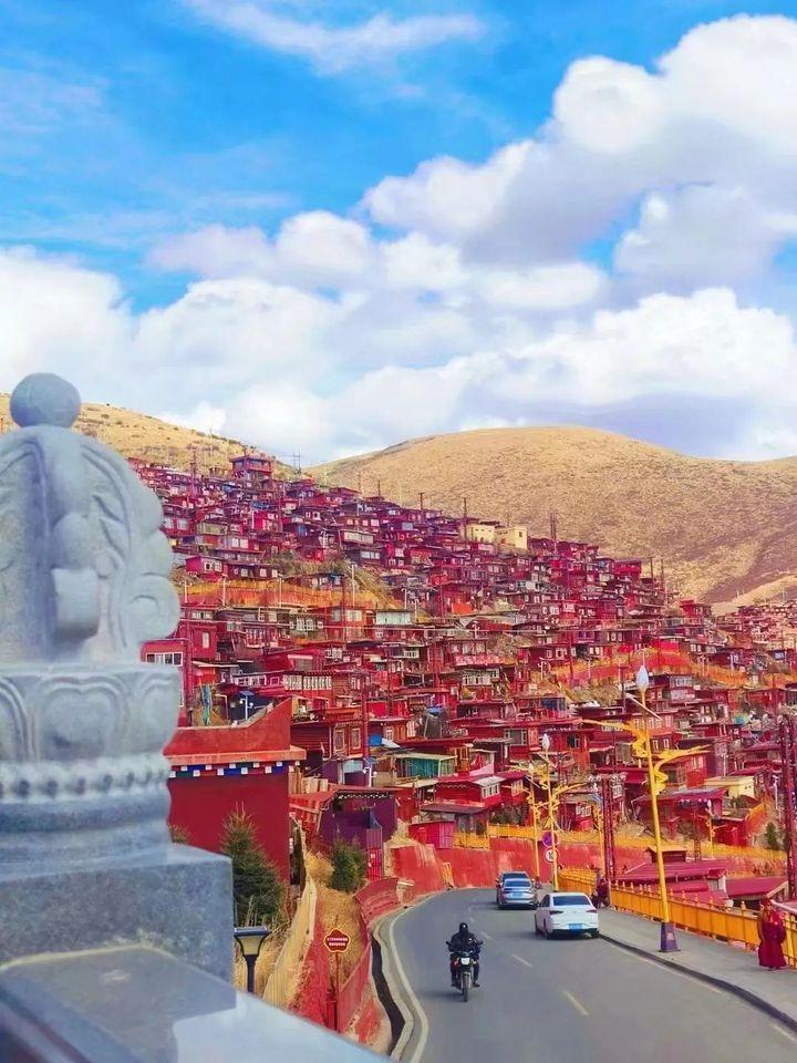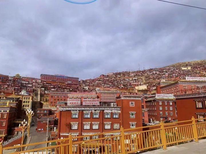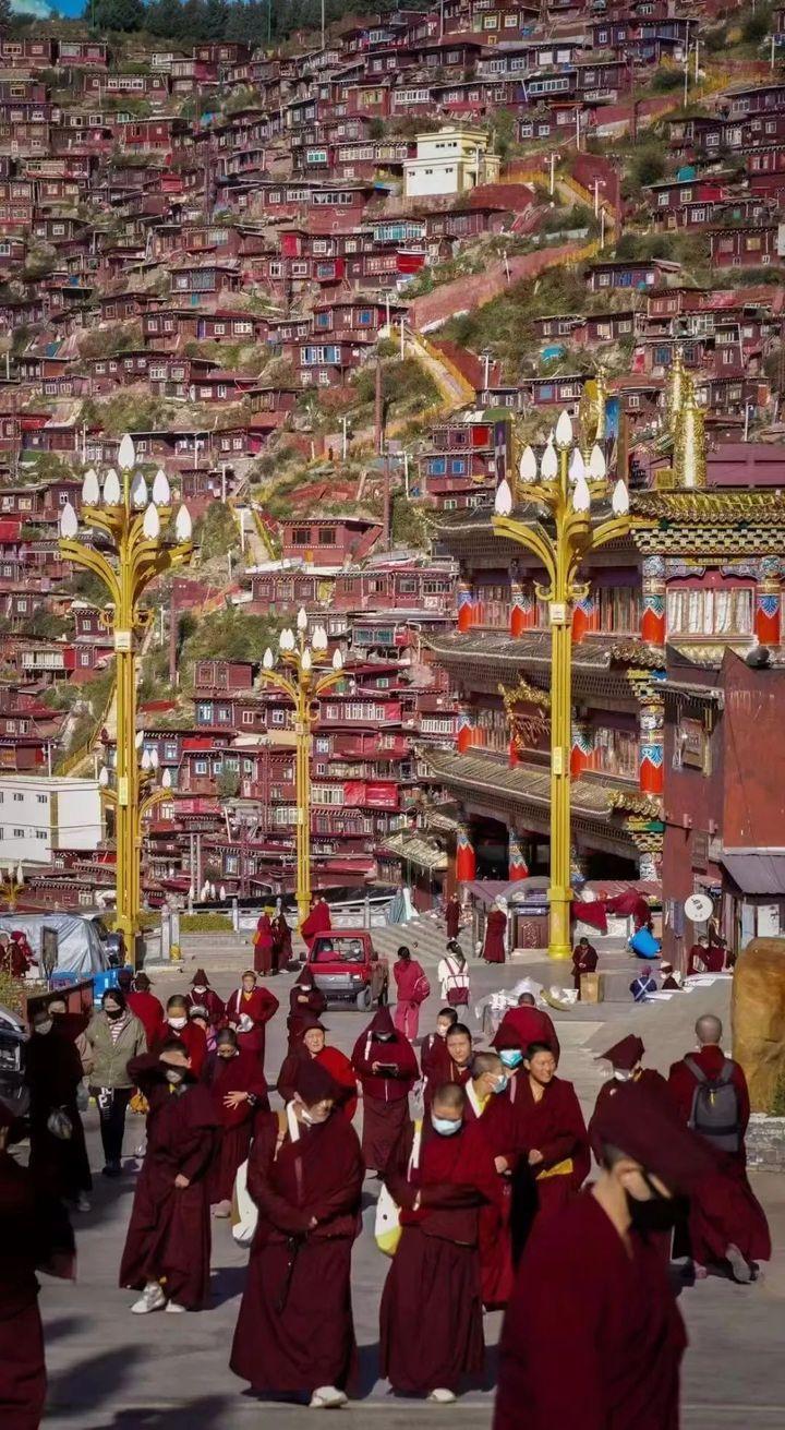 想象一下,数千间绛红色的藏式平房连绵几公里,簇拥着辉煌的寺庙和佛堂,简直壮观到无法用言语形容!
