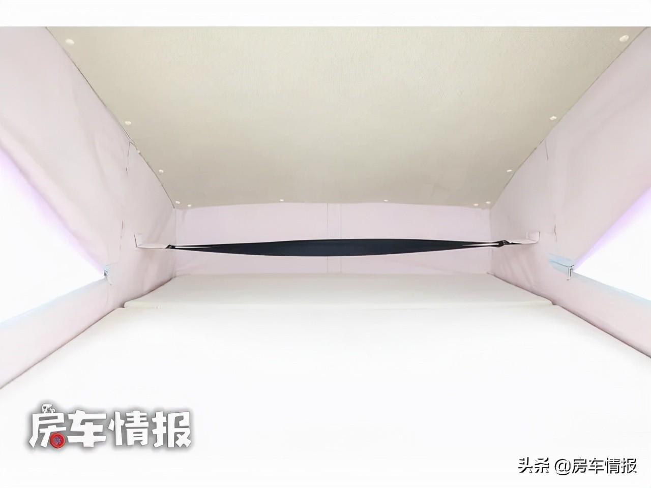 除此之外,这款车还是一款带有升顶机构的床车,当有更多的睡眠需求时,还可以选择在升顶内的双人床休息睡觉,而且周围三面都可以变成透明纱网的形式,白天的时候可以坐在这里享受小憩的时光,晚上则可以拉上隐私拉帘睡个安稳觉。