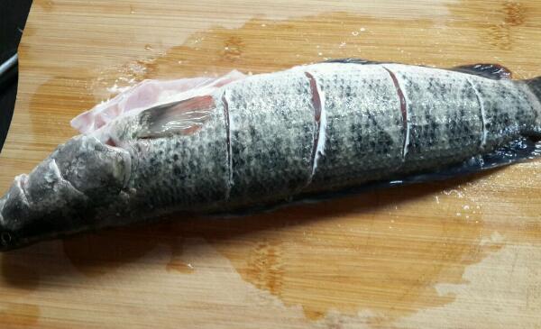 第二步:黑鱼鱼鳞、内脏清干净,并洗净后,取半勺盐洒在鱼身上,用手将盐来回擦洗,再撒上适量的生粉在黑鱼身上,并擦去,这样可以把黑鱼身上粘液粘掉,最后再用水冲洗黑鱼,这时候还有粘液基本可以清洗干净了。
