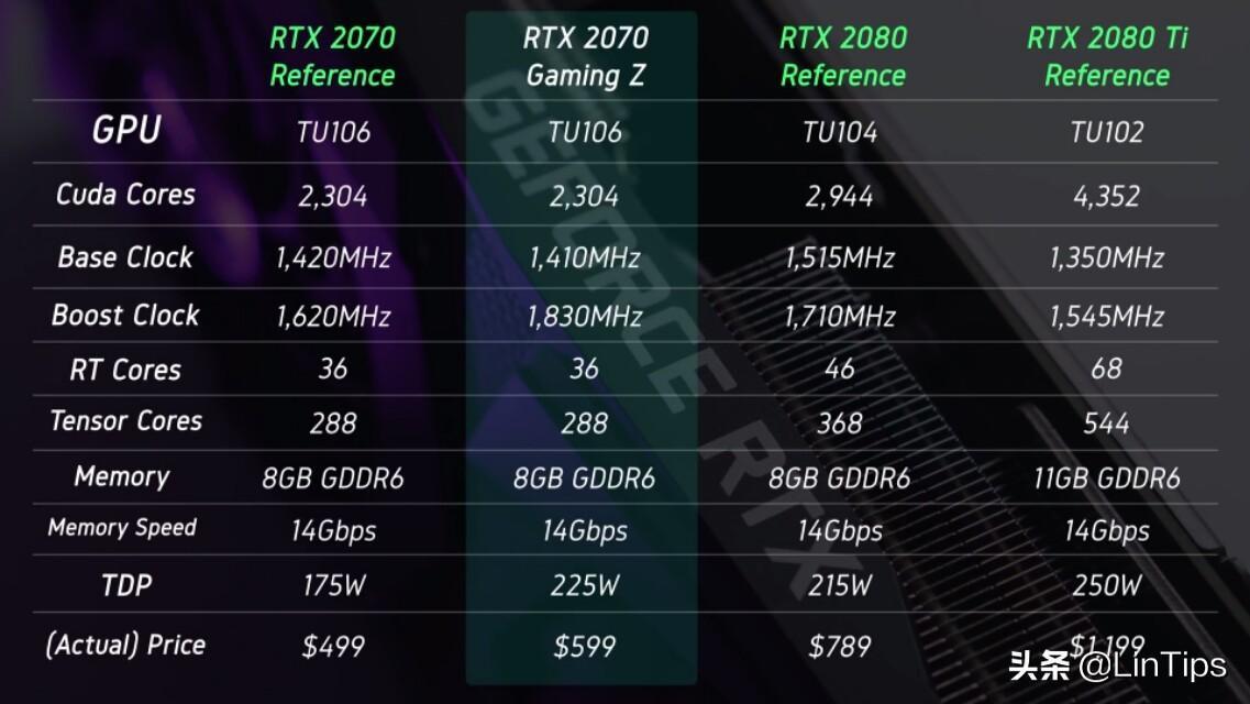 RTX 2070 是基于 NVIDIA 最新的图灵架构的一款中端游戏显卡,相比Pascal架构的GTX 10系列,增加了实时光线追踪技术(RT核心实现),以及AI学习特性(张量核心实现),得益于架构的提升以及GDDR6显存的加持,在默认频率下其传统性能(非光线追踪)已经超越GTX 1080小许。