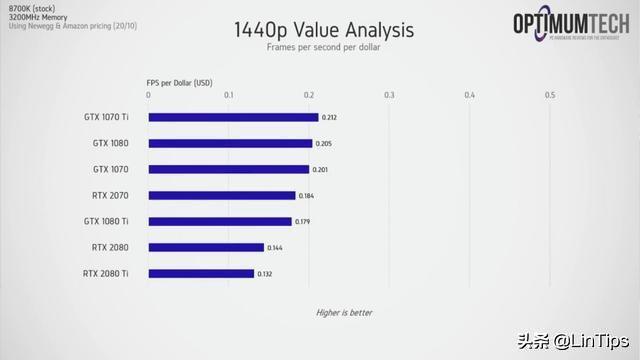 另外该主播还给出一个简单的性价比表格——每美元帧数,越高越好,最后得出GTX 1070 Ti 以及 GTX 1080 的性价比最好,特别是GTX 1070 Ti。而 RTX 系列性价比最好的就是 2070了,总而言之越高端的显卡性价比就越低。