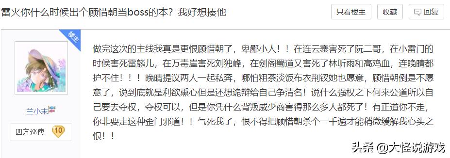 有说玩家喊话雷火——赶紧开发个副本让顾惜朝做个BOSS,我要揍他一万遍!才能缓解心头之恨!他所谓的反抗强权只不过是块遮羞布,正道不走专门走歪门邪道,真是万人恨!