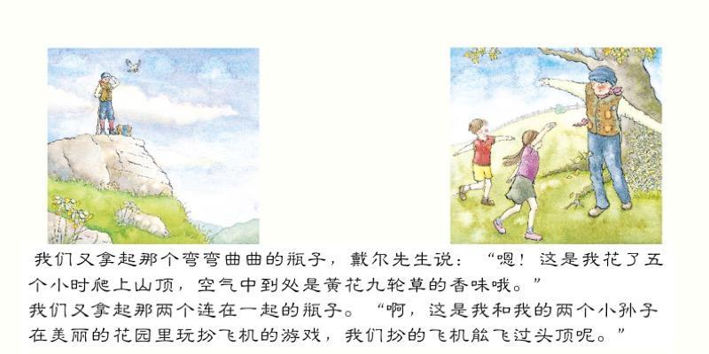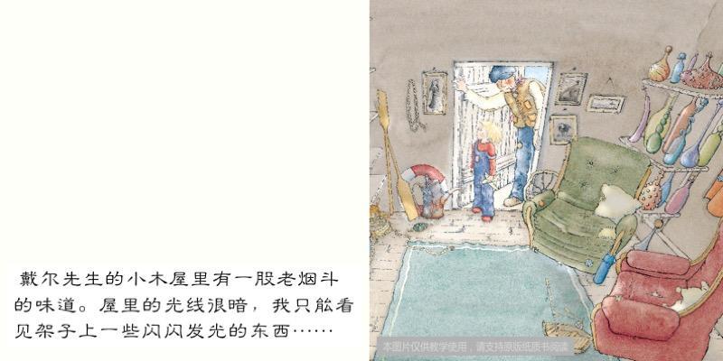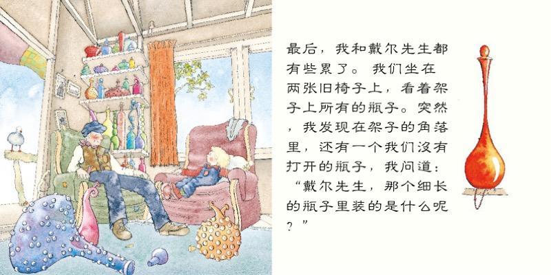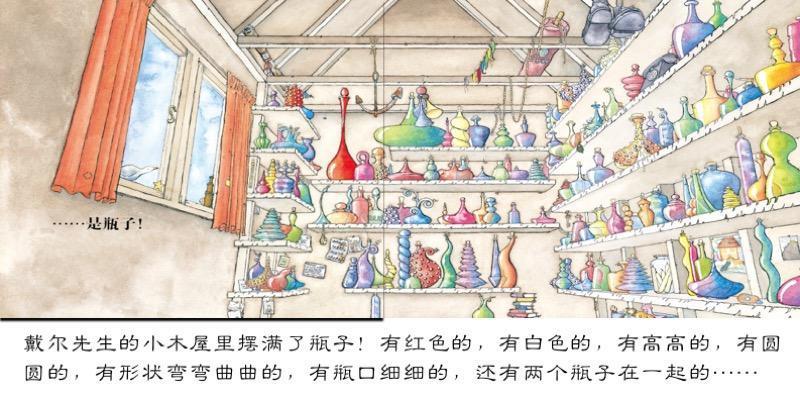 这本书故事的讲述是通过一个神秘的小屋开始的,木屋里各种各样的瓶子也盛满了五颜六色的故事,孩子对每个瓶子的感兴趣,对每个瓶子的故事也感兴趣,通过这个画面还可以让孩子认识一下颜色,因为不同颜色的瓶子有不同的故事的!还可以根据瓶子来认识形状这应该是阅读故事之后的另外收获了。书中讲述故事内容的画面温馨而美丽,给孩子讲述的时候仿佛身在其中的感觉,了解瓶子,了解瓶子的故事,打开书走进神奇的小木屋吧!
