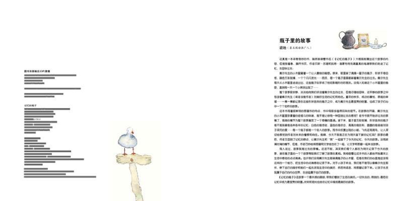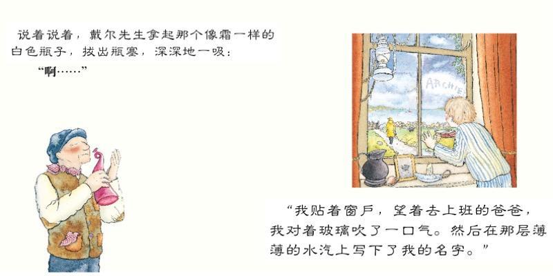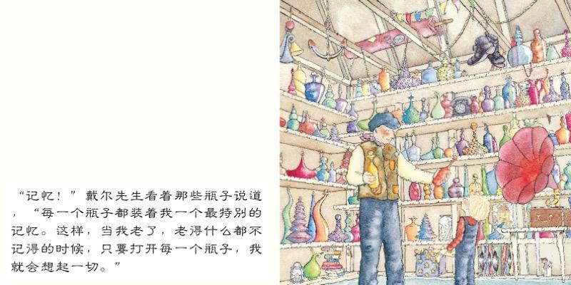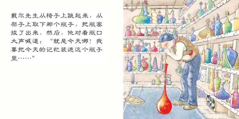 《记忆的瓶子》这真是一本非常奇妙的书,虽然单单看书名(《记忆的瓶子》)大概就能猜出这个故事的内容,但是别着急,翻开书页,作者贝斯·苏珊和凯蒂·潘蒙特用充满童真的笔调带我们走进了记忆,去回味过去。这本书还故事一个最本质的面貌,带我们看到了生活的美好。一切失去的,得到的,最后在记忆中成为最宝贵的财富。欢笑和泪光也会在记忆中凝成最美好的故事。