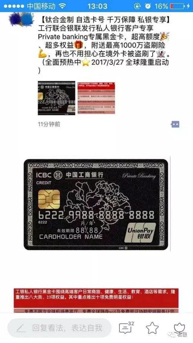 我想是工行终于忍不了美运外包提供的缩水服务,自己为私行客户打造了一款私人银行客户专属的黑金信用卡。钛金的卡板,可以自选卡号,实卡会比这个效果图更好看一点,黑色背景上浮雕着祥云图案,敬请期待,他行的高净值客户想办的话,考虑搬砖过去吧。特别感谢飞客上卡友的爆料。