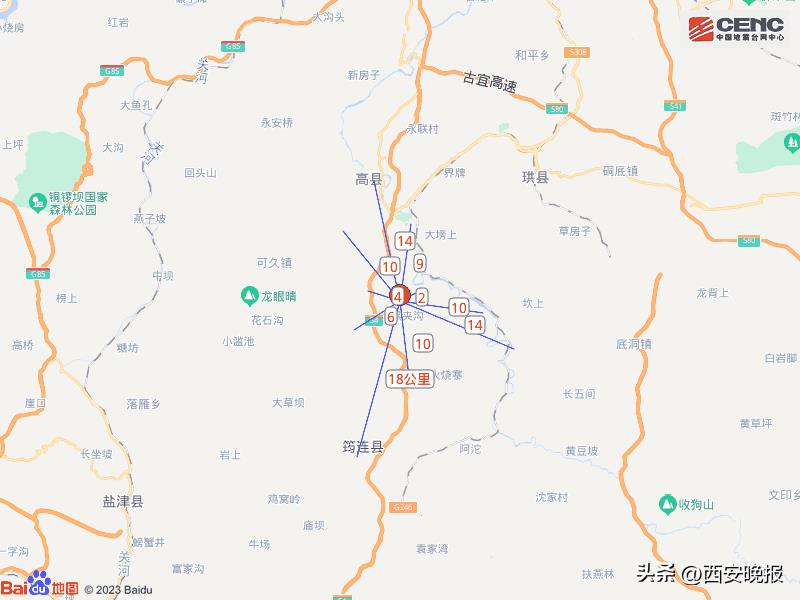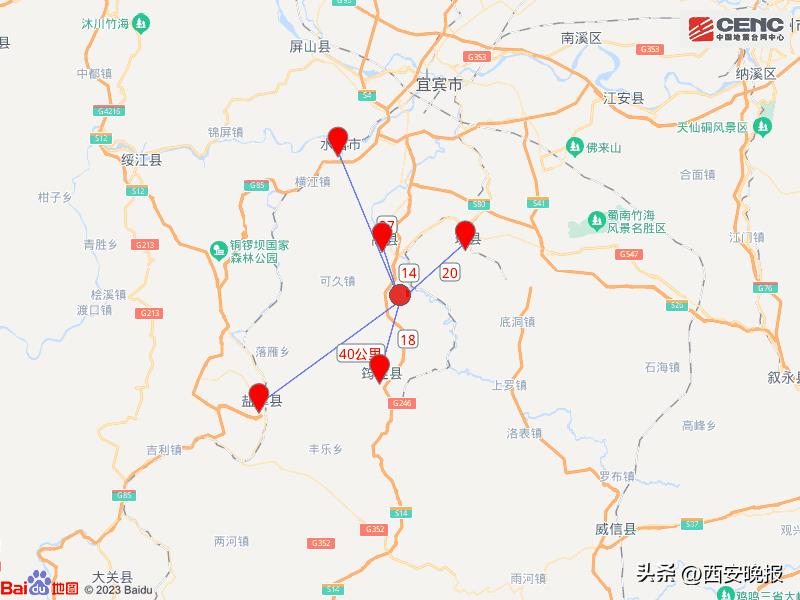 周边县城:震中距高县14公里、距筠连县18公里、距珙县20公里、距云南水富市37公里、距云南盐津县40公里,距宜宾市49公里,距重庆市238公里。