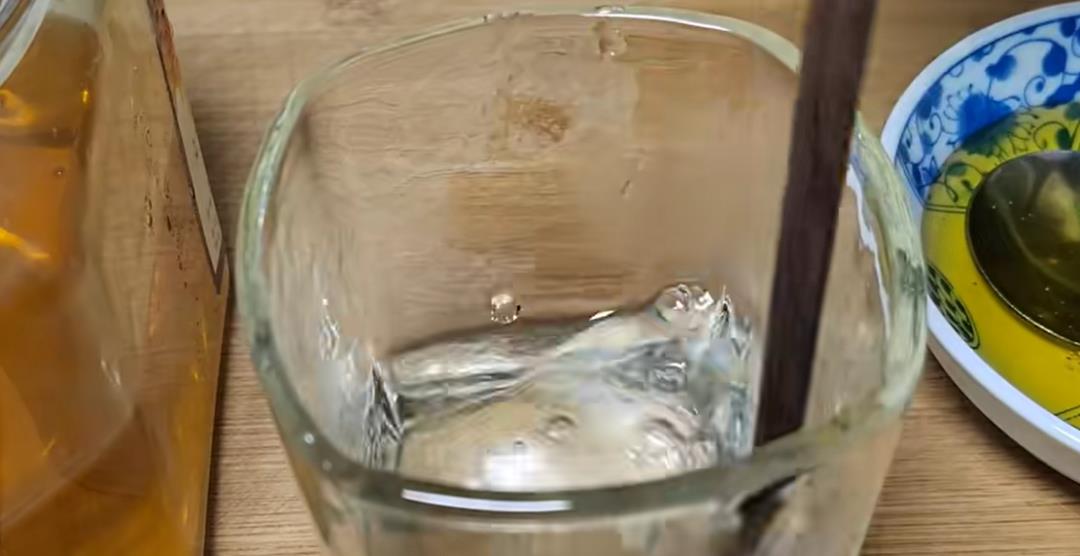 第一种方法是我们先拿一个干净的杯子,然后在里边滴上一点蜂蜜。再加一点点的温水进来,然后再用一只筷子这么搅拌,如果是真蜂蜜,搅拌之后它这个泡泡特别丰富,而且消泡沫慢,如果里边的泡泡消得特别快的话,不用怀疑,这个肯定是假的蜂蜜了。
