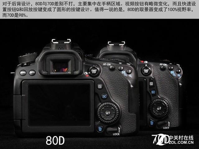 好了,说了这么多我们将目光回到机身本身,下面我们就来看一下80D和70D的对比图。佳能70D和80D在体积上基本一致,但是新镜头的棱角要圆润很多。