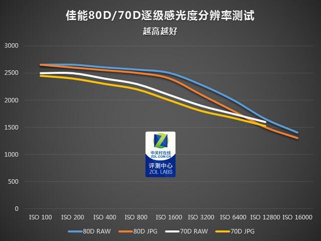 解析力的控噪是一方面,另一方面,我们来看一下两款相机的逐级宽容度解析力对比。这里我们同样对比佳能80D和70D在JPG和RAW文件两种格式下,在不同ISO时的分辨率表现,这样可以直观看到提升高感对于两台机子的细节损失有多大。