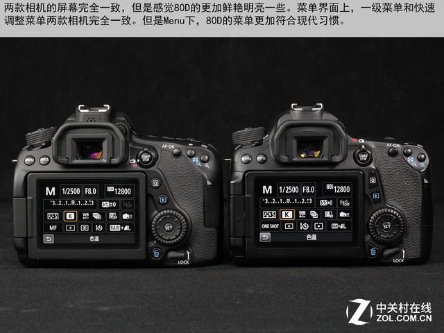 机身来看,80D依然采用了翻转屏+触控的屏幕,像素依然为104万像素。但是从成像质量来看,似乎80D的画面更加清晰一些,亮度也更高了一些,能够在强光下更好的看清画面。
