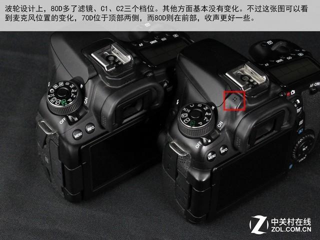 在顶部设计上,佳能80D与70D基本一致。两个区别一个在于拨轮,多了三个新的档位,一个在于麦克风位置。麦克风原来设计于机顶两侧,而新的80D则在机顶正面部分的两边,更加有利于正面收声。