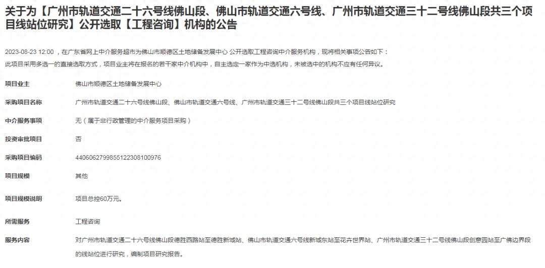 近日,广东省网上中介服务超市发布了关于为【广州市轨道交通二十六号线佛山段、佛山市轨道交通六号线、广州市轨道交通三十二号线佛山段共三个项目线站位研究】公开选取【工程咨询】机构的公告。