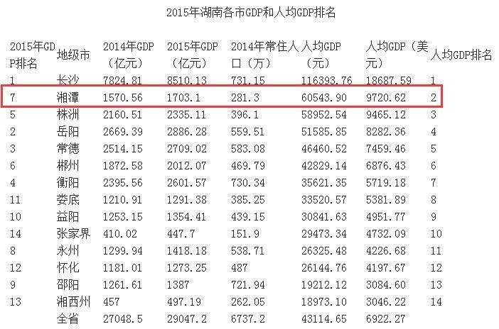 2015年,湘潭市GDP1703.1亿元,排名湖南省第7位。人均GDP60543.90元,仅次于长沙,居湖南省第2位。