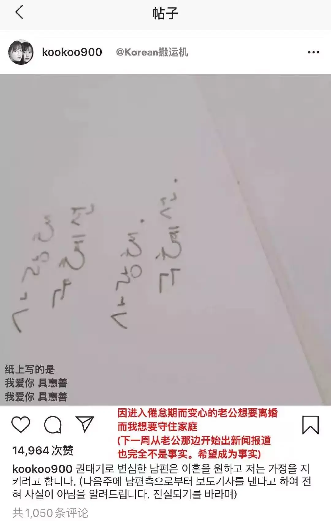 事情的起因是具惠善自己在ins上发状态,表示:“因为倦怠期而变心的老公,想要离婚,而我想要守住家庭。”