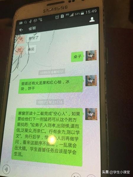爸爸来替女儿领奖的时候,拿出一个摔碎了屏幕的手机,里面就存着这条微信。2017年10月6日,妈妈还在微信里嘱咐女儿,“桌子里面还有火龙果和红心柚,冰块,饼干。”接着是10月7日的那条190字的长微信,苦口婆心劝说女儿,“寒窗苦读十二载竟成‘空心人’……学生的首要任务应该是学会生活。”