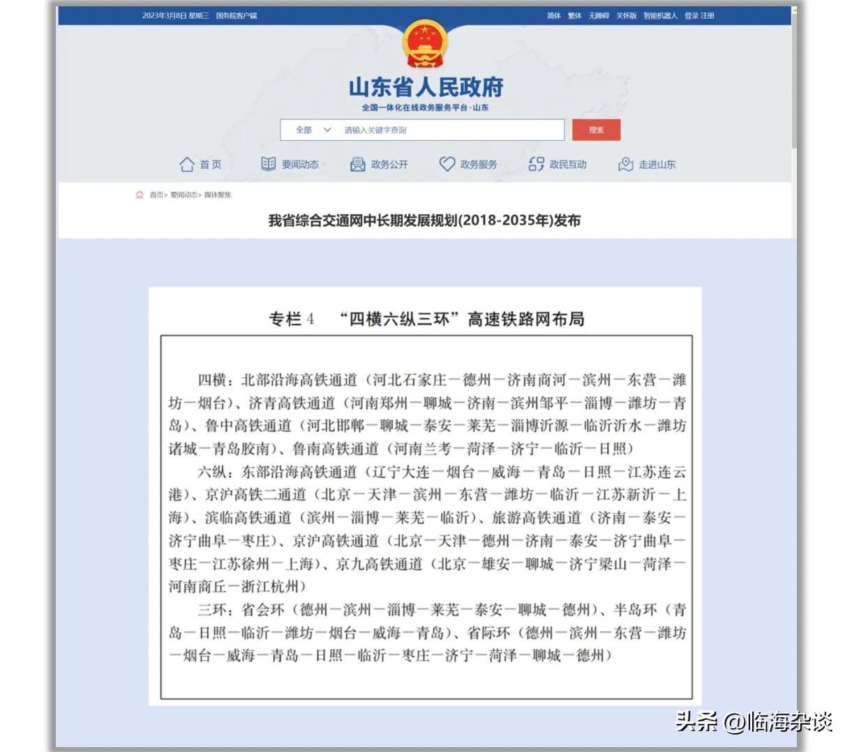 2018年,山东省印发《山东省综合交通网中长期发展规划(2018-2035年)》。规划中指出,山东省大力支持“四横六纵三环”的铁路发展总格局。着力推进京沪二线,鲁中高铁,滨临高铁,济青高铁,北部沿海通道等铁路的建设。