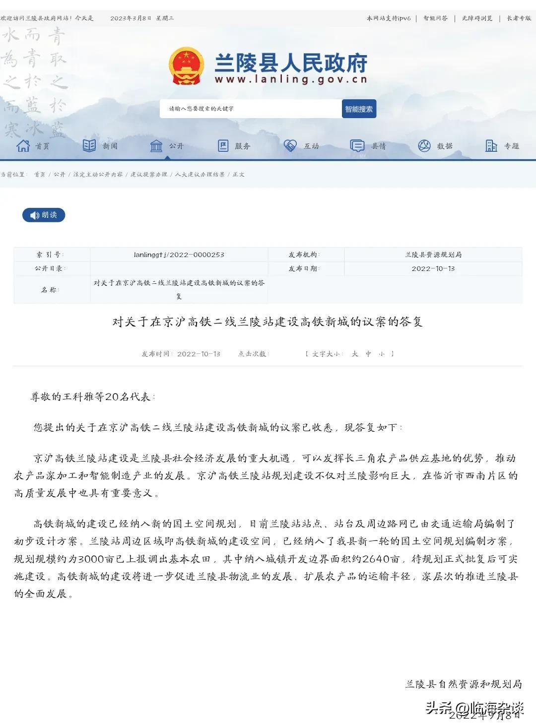 高铁新城的建设已经纳入新的国土空间规划,目前兰陵站站点、站台及周边路网已由交通运输局编制了初步设计方案。兰陵站周边区域即高铁新城的建设空间,已经纳入了我县新一轮的国土空间规划编制方案,规划规模约为3000亩已上报调出基本农田,其中纳入城镇开发边界面积约2640亩,待规划正式批复后可实施建设。高铁新城的建设将进一步促进兰陵县物流业的发展、扩展农产品的运输半径,深层次的推进兰陵县的全面发展。