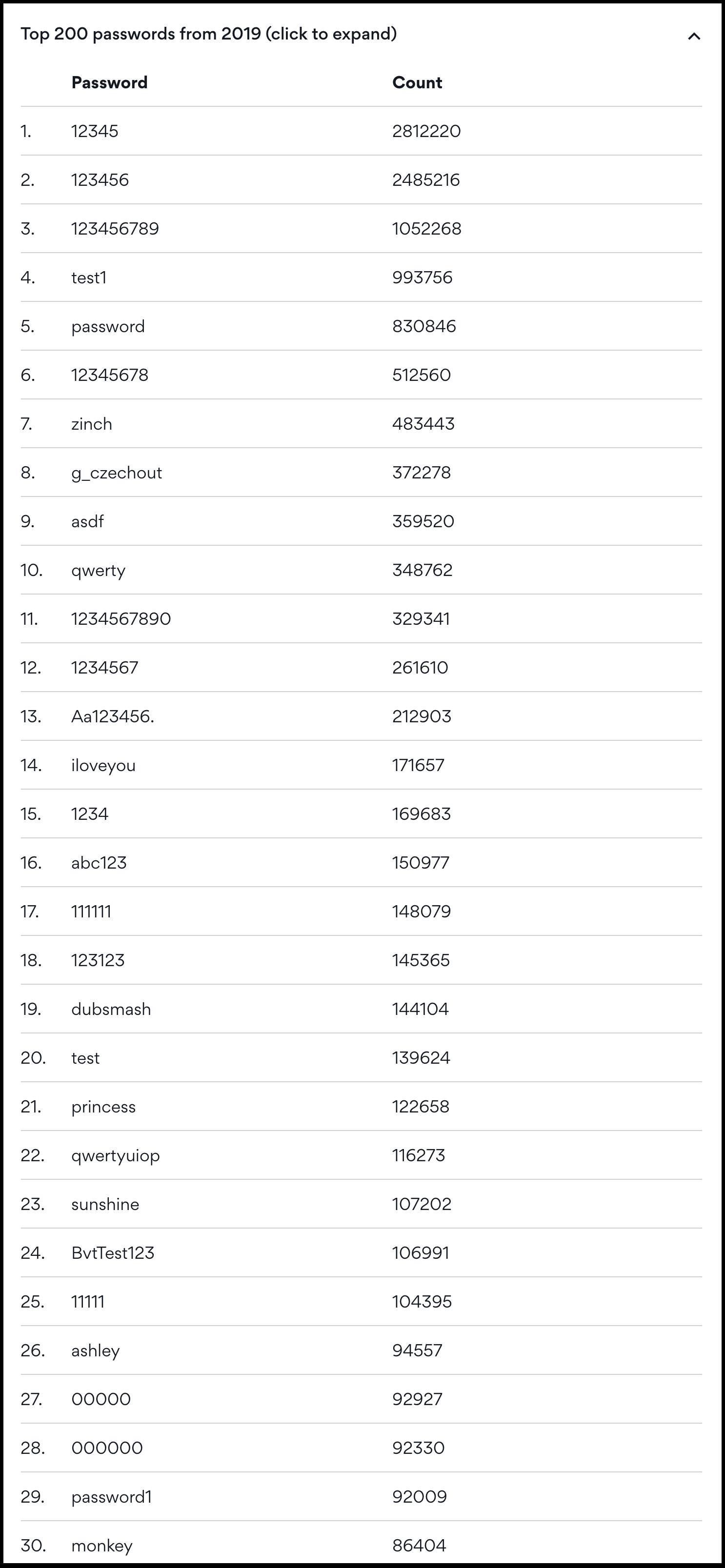 根据安全业者NordVPN旗下一款名为「NordPass」应用程式,公布今年网友最常使用前200名的密码名单。数据统计结果中,发现第一名为「12345」,统计超过281万笔;第二名为「123456」超过248万笔;第三名为「123456789」超过105万笔。