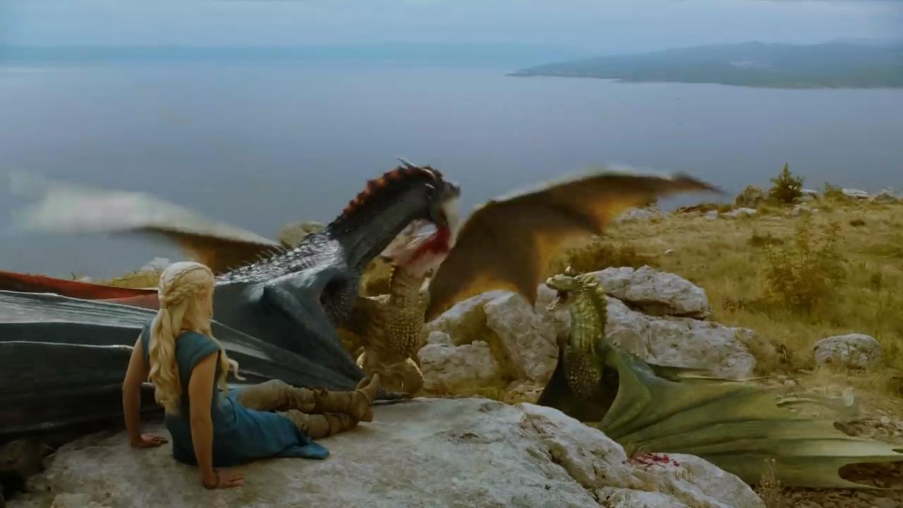 三条龙已经长大了,他们可以自己不但可以自己觅食,还学会了抢夺食物,即使是龙母也不能阻止他们,