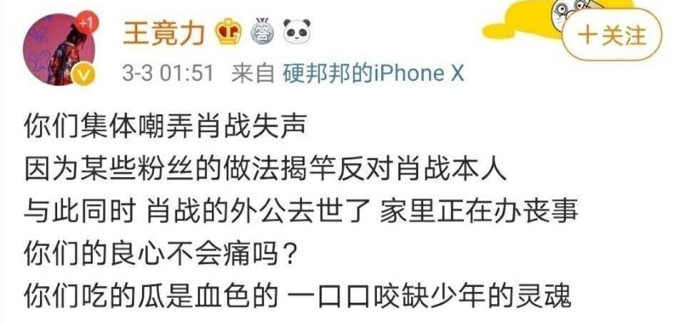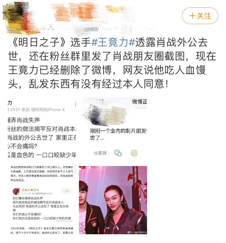就在3月3日凌晨,一个叫王竟力自称是肖战好友的人发文称肖战外公去世,家里正在办丧事。并怒斥网友:“你们良心不会痛吗?你们吃的瓜是血色的,一口口咬缺少年的灵魂”。虽然王竟力随后很快删除了这条微博,但还是被细心地网友截图并转发,引来众多吃瓜群众围观。