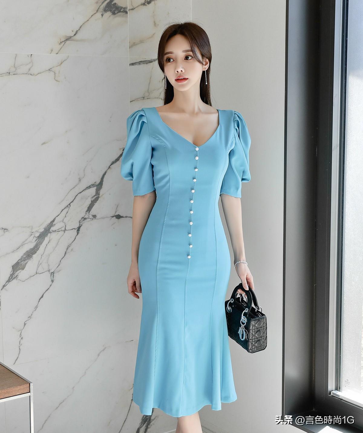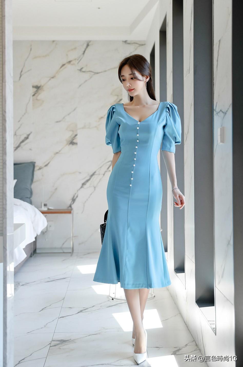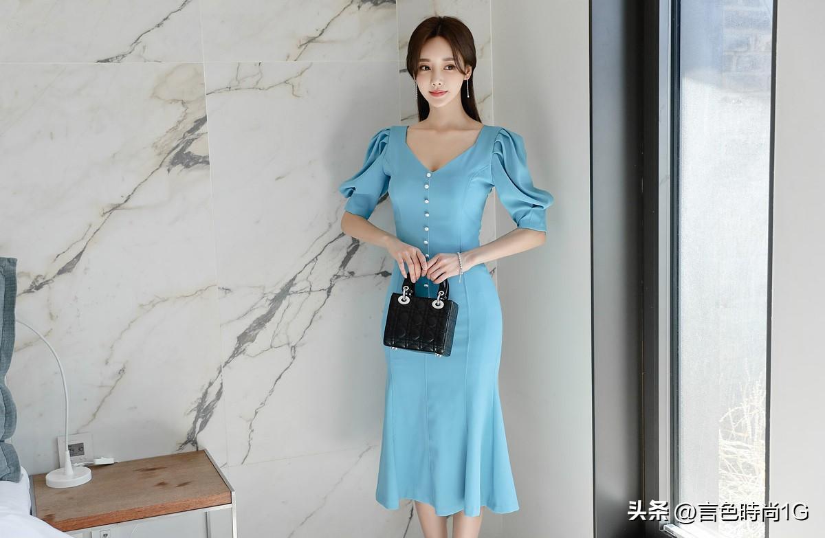 除却色彩的突出表现,连衣裙在修身版型的塑造中,公主线分割与开衩下摆,进一步衬托女性的婀娜身姿。
