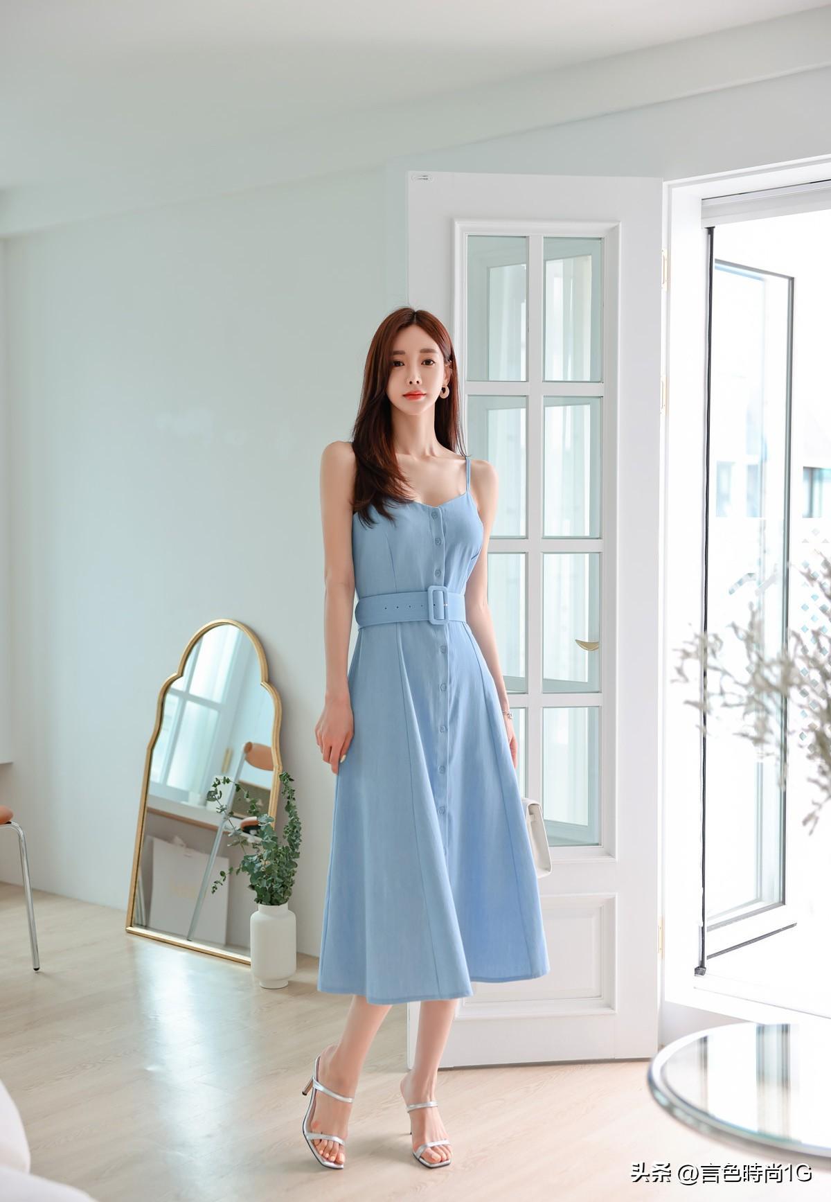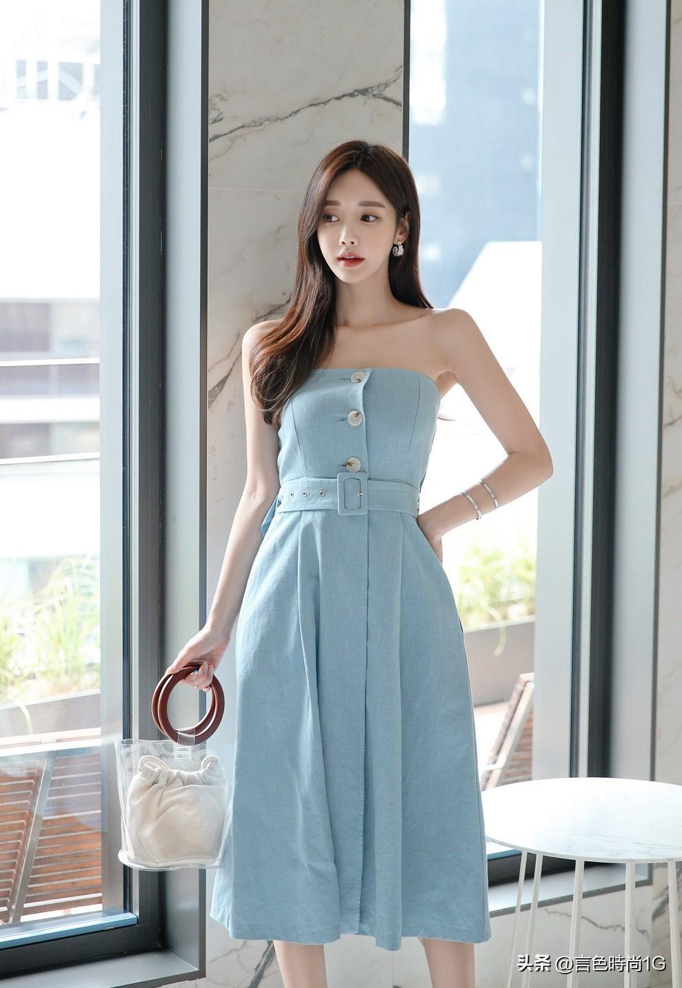 缎彩谧蓝维纳斯清新抹胸长裙