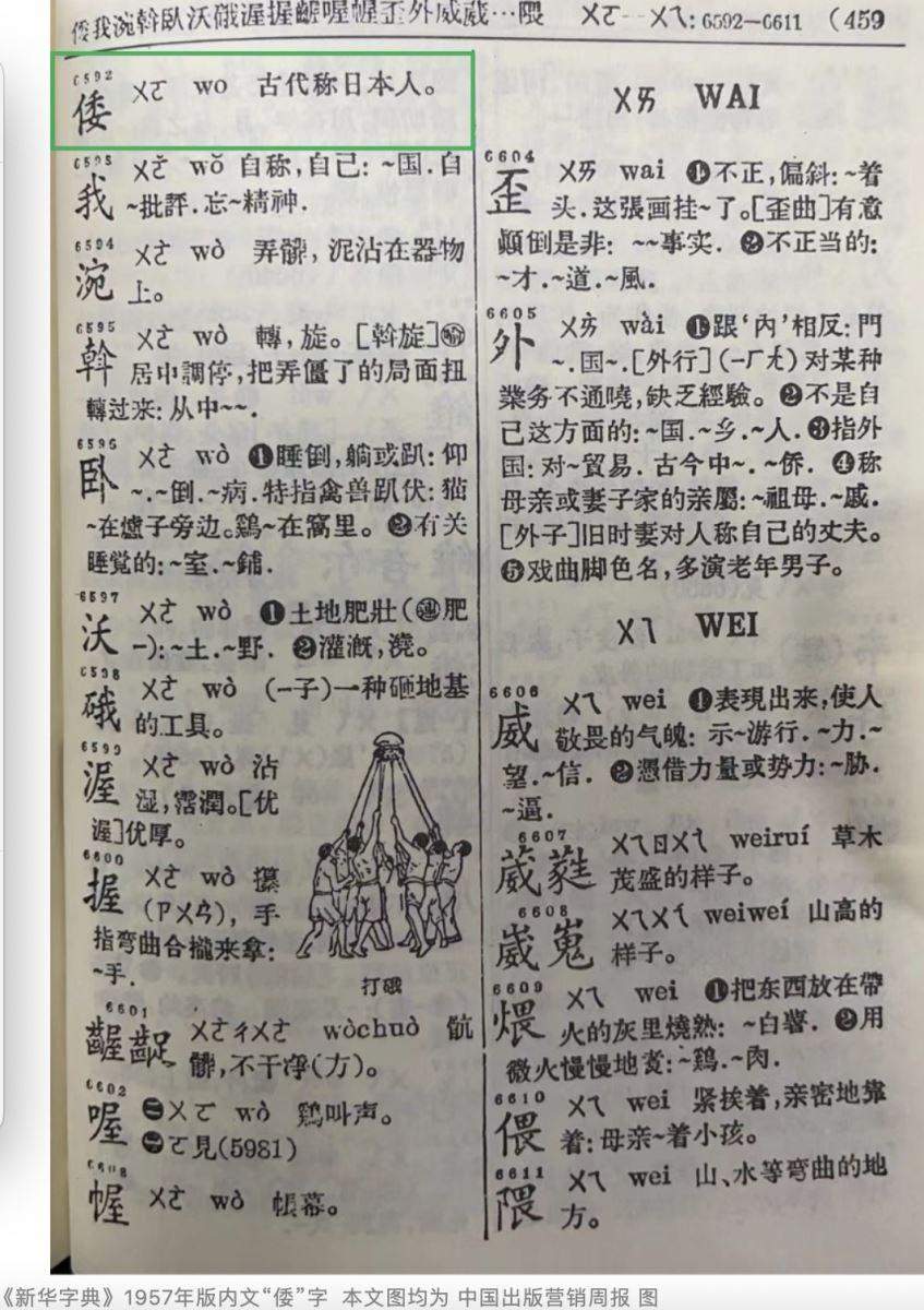 1957年版的《新华字典》,“倭”字的解释为“古代称日本人”;之后《新华字典》出了许多版,“倭”字的解释修改为“古代称日本”,这个更为准确。《现代汉语词典》和《新华词典》一样,因为是“词典”,且是中型规模,各个版本里均一直收录有“倭寇”一词。