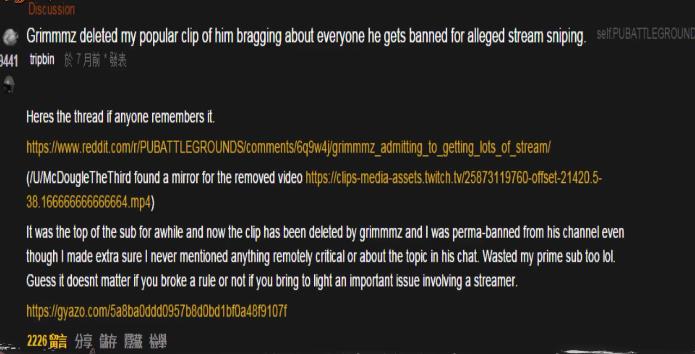 还有就是无处不在的狙击大军。国内的主播通常会在自己直播时设置足够长的延时以阻止那些想要故意狙击主播的人。但是固执的Grimmmz还是没有设置延迟,这也导致被狙击的情况一度普遍发生。最后,忍无可忍的Grimmmz在自己的频道宣布自己已经提交了足够充分的证据让狙击者遭到封号。狙击者们也证实了这一消息,虽然他们仍然坚称自己是无错的。