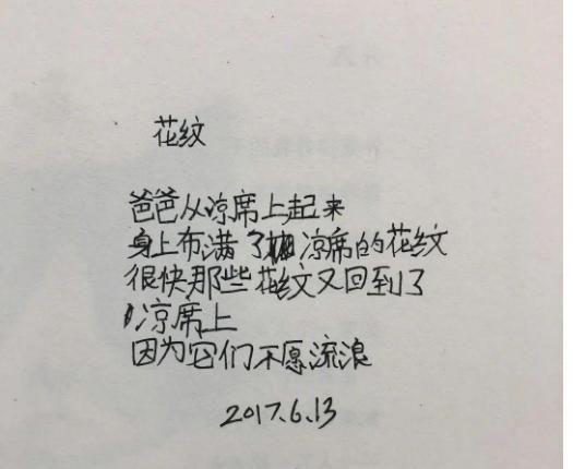 她写的《花纹》:“爸爸从凉席上起来/身上布满了凉席的花纹/很快那些花纹又回到了凉席上/因为它们不愿流浪”,让人们想起了蝉鸣鸟叫的夏天,闷热的天气睡在凉席上身上被短暂地印出凉席的纹路,不一会儿就消失了。就像我们的童年,虽然短暂但是却在我们的心里留下了无法磨灭的印记。