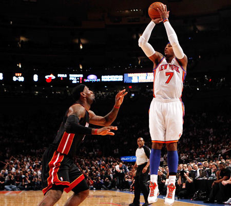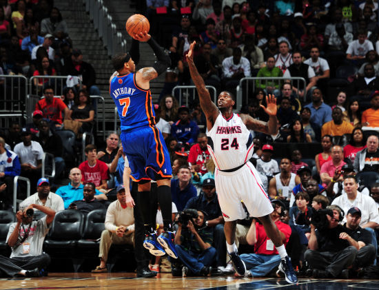 另外就是,各位需要注意,有得就有失,这种投篮的一个劣势,就在于受干扰后或者说滞空后左手干扰容易加大,甚至右臂发力容易变形。这里说的干扰并不是身体接触,而是防守单纯的压力所带来的干扰。在这些时候,你可以观察安东尼的投篮,在空中肘部往往会有个上下波动,然后出手的时候左手不会像无防守时候那样几乎不改变形状就可以投篮,而是在出手瞬间左手有个晃动,这个晃动就是干扰投篮的一个标志。而这,在关键时刻往往也是致命的。