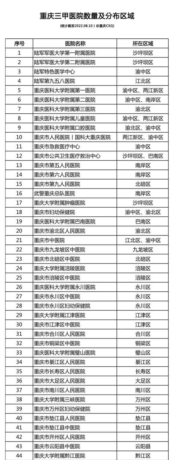 截至8月中旬,重庆市三甲医院达到了44家,这个数量已经可以超过中西部很多省的数量。从分布来看,主城9个区中,除了大渡口区还没有三甲医院以外,其他区都有至少1所三甲医院。