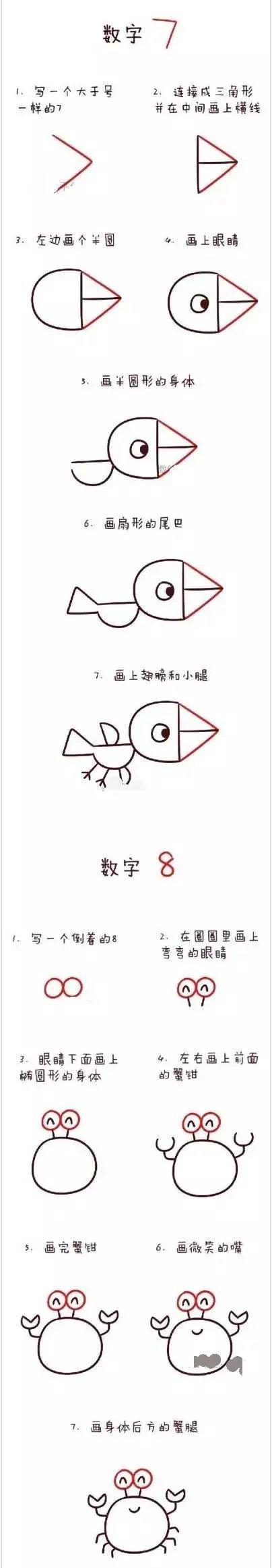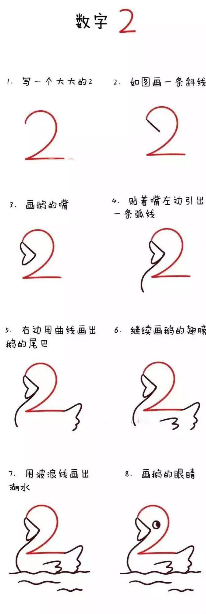 下面的简笔画你们画成以后不妨跟宝宝现场来头脑风暴,想想这些数字还可以画成其他哪些动物?