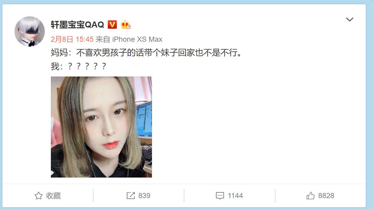 轩墨宝宝此前也曾在微博公开母亲对他说的玩笑话,"不带男友回家的话带个妹子也不是不行",也许也正是轩墨宝宝情感上的一丝无奈。