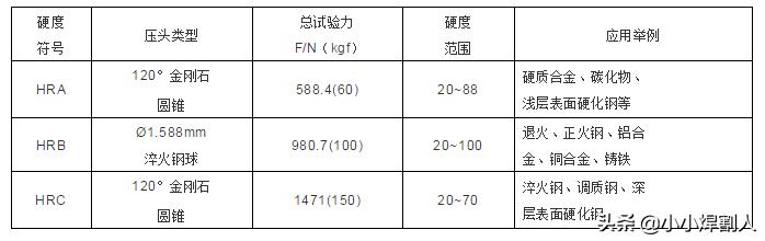洛氏硬度试验采用三种试验力,三种压头,它们共有9种组合,对应于洛氏硬度的9个标尺。这9个标尺的应用涵盖了几乎所有常用的金属材料。常用的有HRA、HRB和HRC三种,其中HRC应用最广。