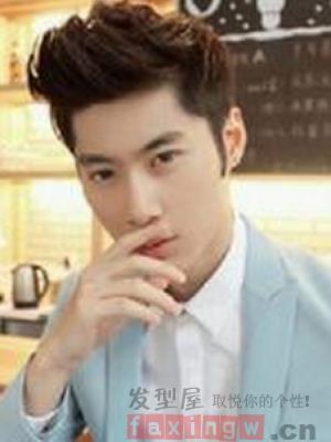 浅色系的西装外套,内衬白色的衬衫,搭配上看无刘海的飞机头短发烫发发型,白净又帅气的脸庞,型男必备。