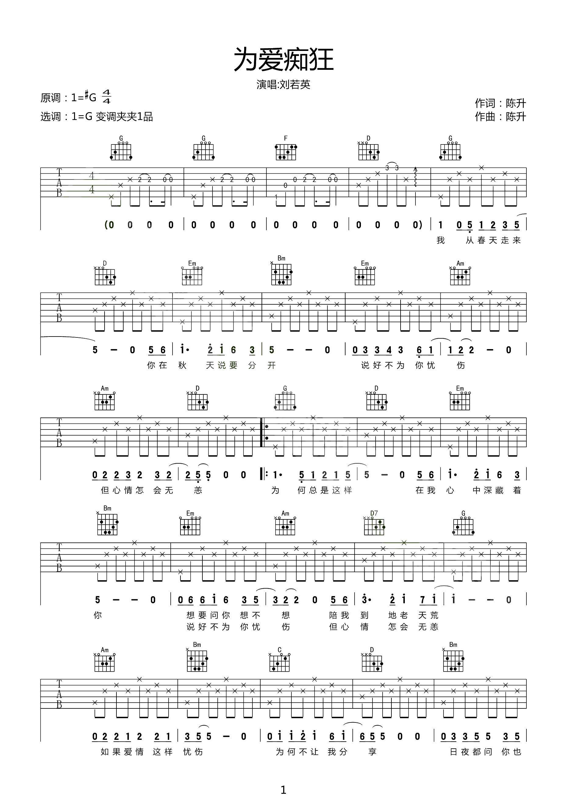 同学们可以对照谱子和音频来演奏。原调#G调,本谱采用G调,变调夹需夹1品。以下是刘若英的《为爱痴狂》音频欣赏: