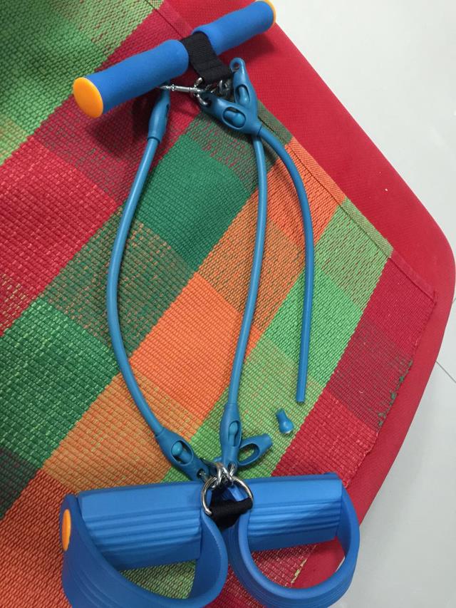 起初买到这个东西的时候还是有顾虑的,毕竟是胶皮管,加之两边有铁环,生怕断了会伤到人,正常使用了3天,觉得还好,第四天使用,做下图的这个动作,练习腹肌,悲剧就发生了,一根胶皮管突然断裂,啪的一声,然后就感觉有脸非常的疼痛。