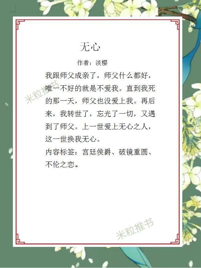 师徒恋,男主上一世因为修炼所以无心,不爱女主,女主后来难产而死,这一世变成女主无心,男主开始了追妻之路,强推!