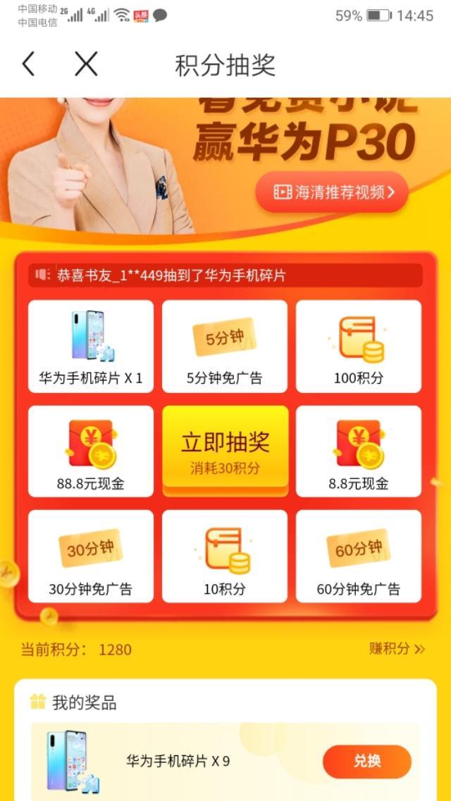 本人爱看小说,在头条中看到疯读小说抽手机的广告后下载,一是看头条新闻或小说打发时间,二是看看疯读小说是怎么个套路,1月18号下载后直接送2个碎片,再一天用积分兑换一个,共3天,加上送的2个共5个,每天九宫格30积分抽奖一个,4天共抽到4个,9天就集齐9个碎片,第十天后每天抽十次,其中抽到免5分钟广告5次、10个积分4次、免30分钟广告一次,到今天6号共8天,天天如此,所以说后台已经被设置,能不能抽到最后一个碎片呢?欢迎大家留言评论。