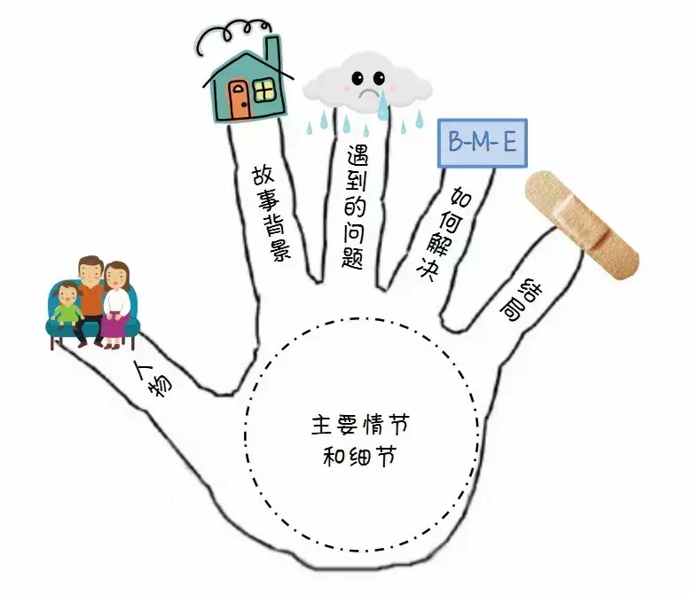 五指复述法就是,利用五根手指头分别代表故事里五个重要的内容: