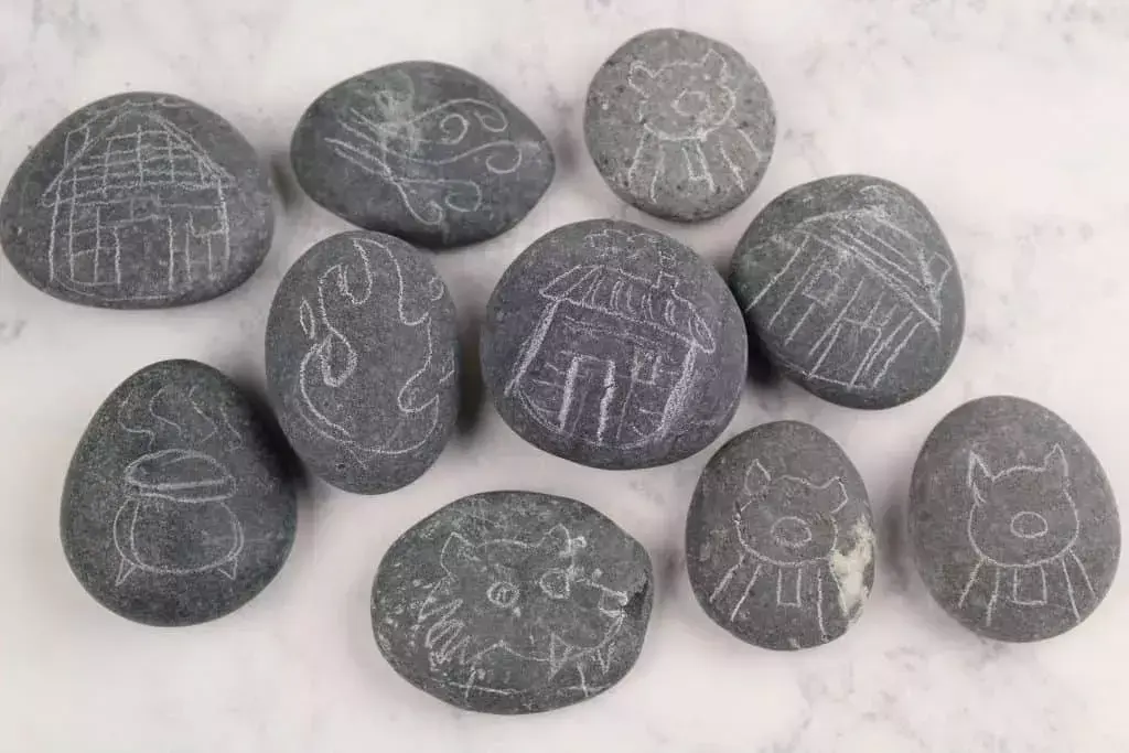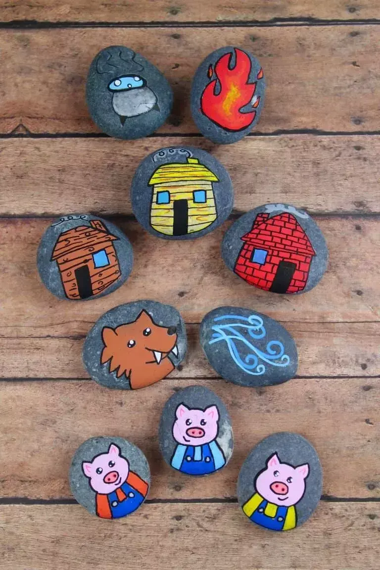 我们把做好的石头放进一个不透明的袋子里,由娃任意抽取几块,然后利用五步复述法,把这几块石头上的东西编出一个故事!