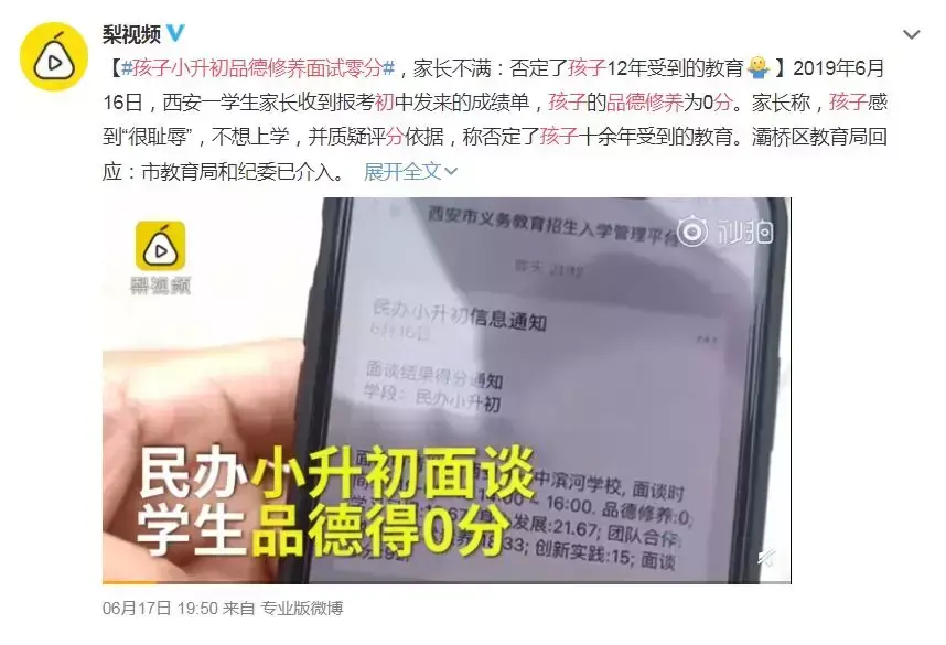 最近,一则12岁孩子小升初面试品德修养零分的消息引起热议↓